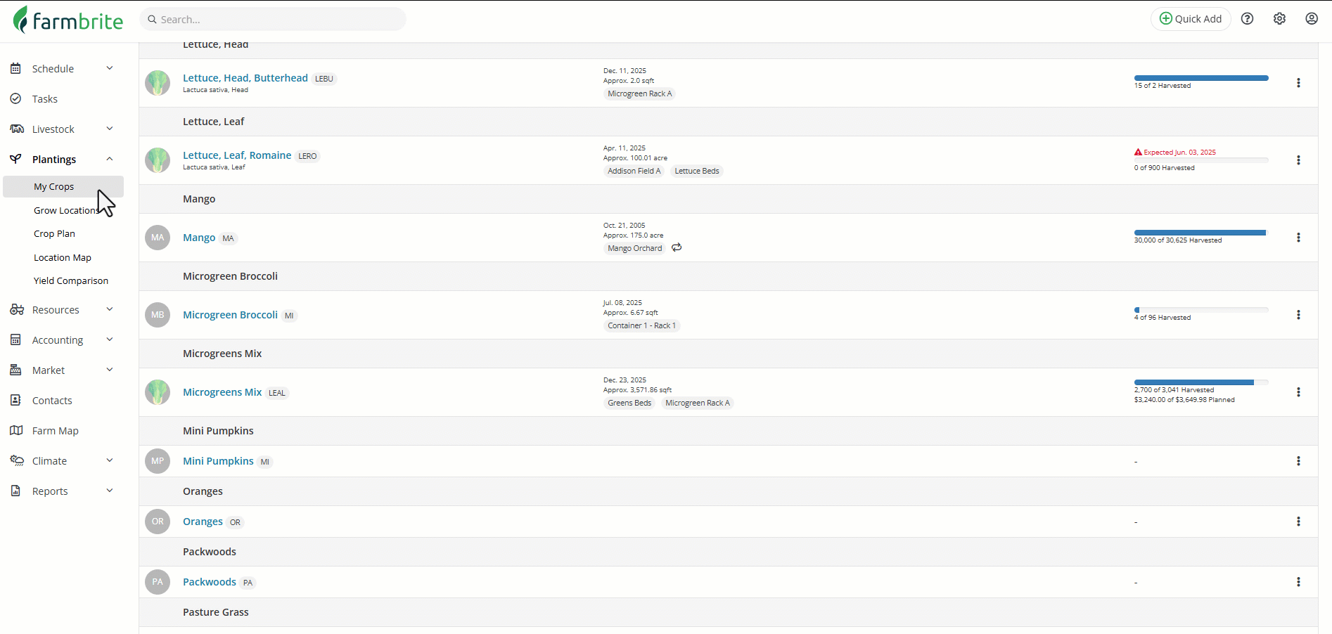 After putting in all the hard work to take care of your crops over the season, you're now ready to harvest them and reap the rewards of your dedication and careful care. You've planted the crops in a grow location, and probably treated them over the course of their growth. Maybe you checked off some tasks, took some notes, and added pictures and documents to the planting as well. The time has come, and you're now ready to harvest your crops and track your yields, and then optionally add them to your inventory and storage and sell them in your Farmbrite market. Let's take a look at how you'll create these records and track them over time.