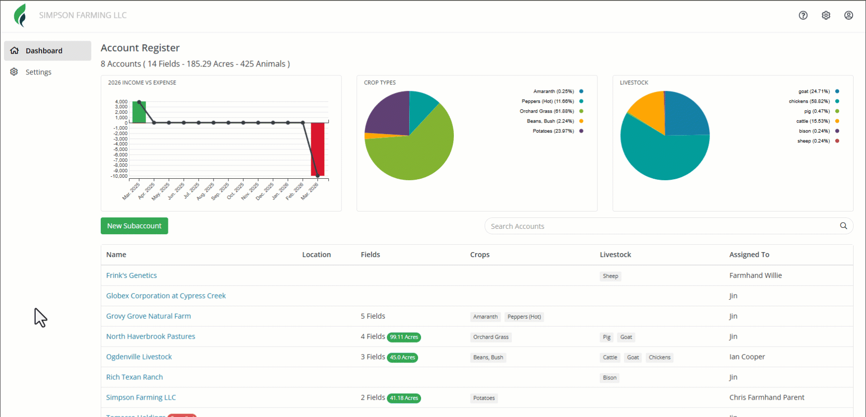Farmbrite offers the ability to track multiple businesses or locations separately from each other through a multi-farm account. This can help you keep your animals, crops, equipment, tasks, and financial transactions separate, as well as give you the opportunity to ensure you grant access to the right data to the right people. Maybe you have a farmhand who should have access to only one of the accounts to perform their duties, and a manager who oversees the entire multi-location operation who needs access to all of them. You might also have some regional or assistant managers who work with some of the accounts, but not others. You'll have the ability to decide what level of permissions your uses have, and which subaccounts they can access.