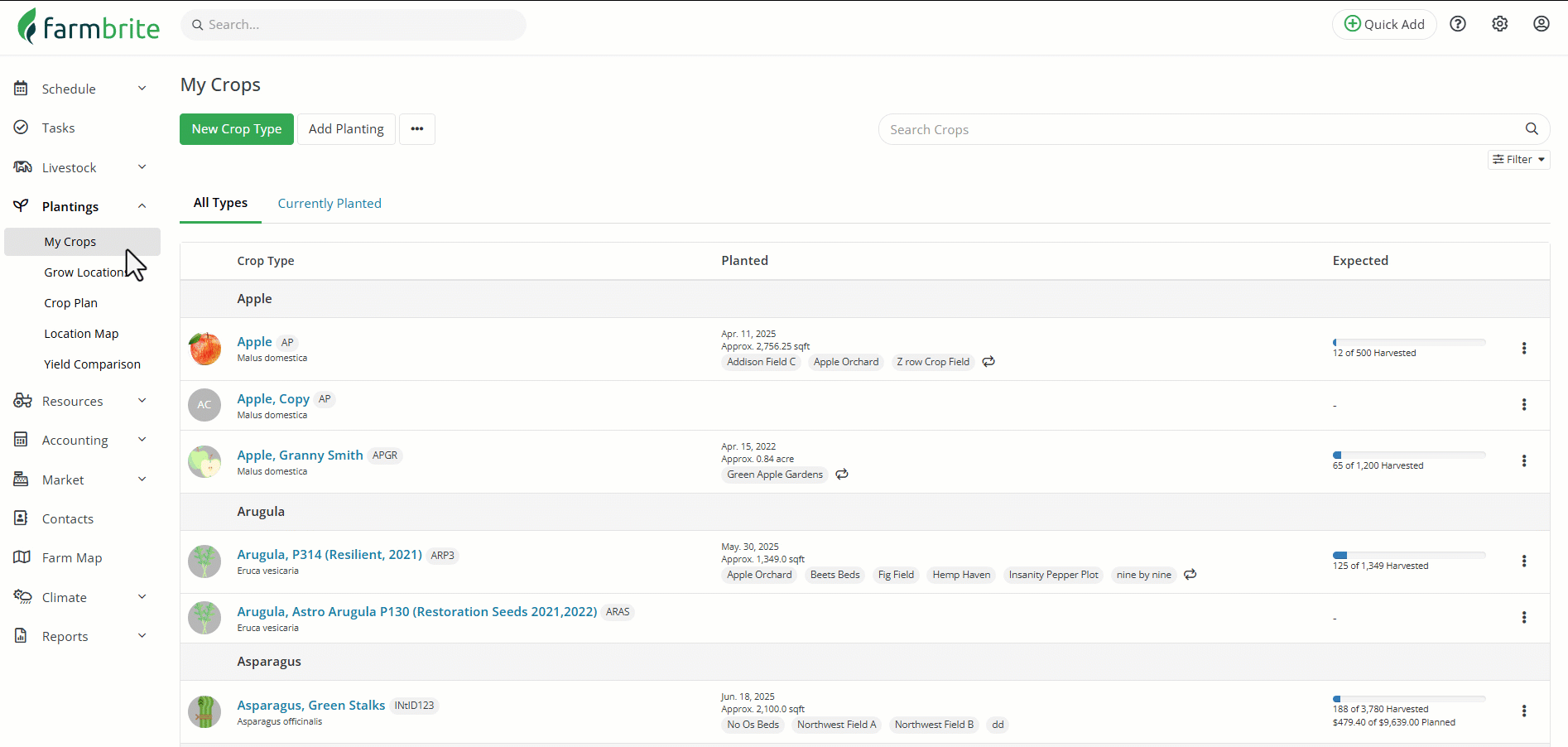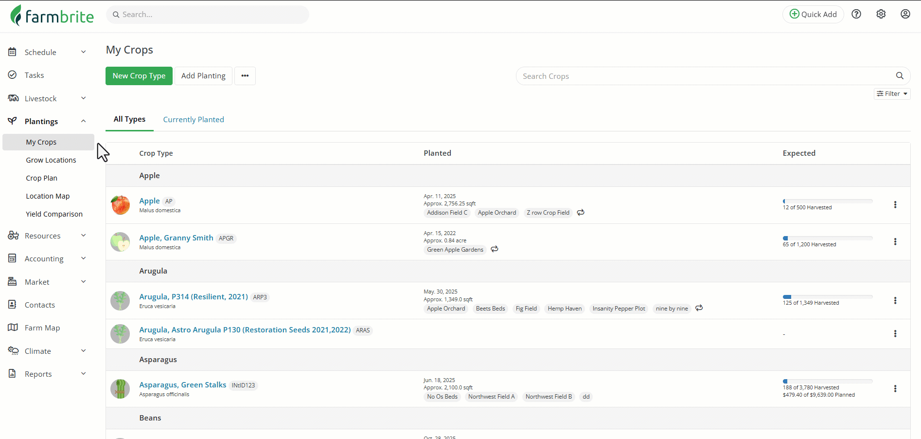 You'll see any crop type you've ever created here, with tabs for All Types, and Currently Planted. In the example above, we scroll through the list, and then access the Currently Planted tab. Note that all crops in the Currently planted tab have data in the Planted and Expected columns, while some in the All Crops tab do not, as they might represent crops we've grown in the past, or plan to grow in the future.
