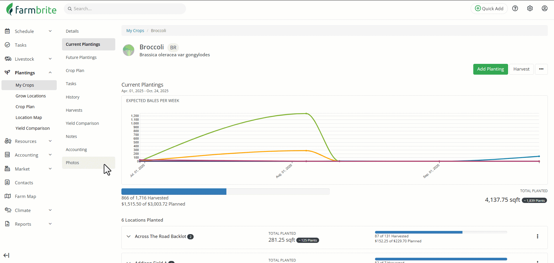 You'll immediately be brought to the Current Plantings tab for the type, which shows a chart of your expected upcoming harvests for this season, and a progress bar for what has been harvested so far. The plantings of this crop type are displayed too, organized by the locations they are planted. You can expand any location to see the plantings in it, and use the bulk actions tool to work with all the plantings at once. Of course, you can click on any individual planting from here as well to work with it singularly.